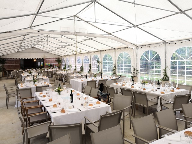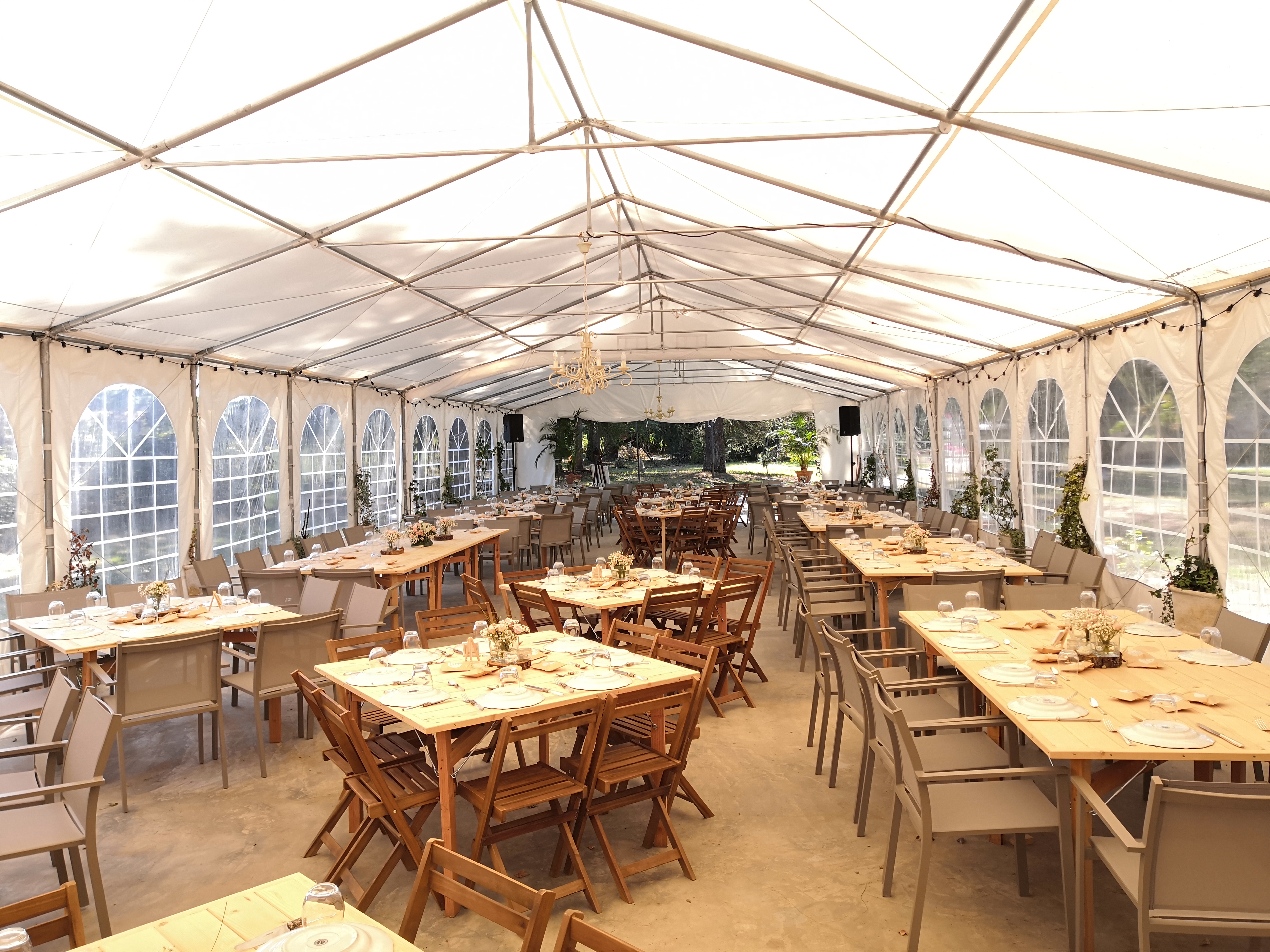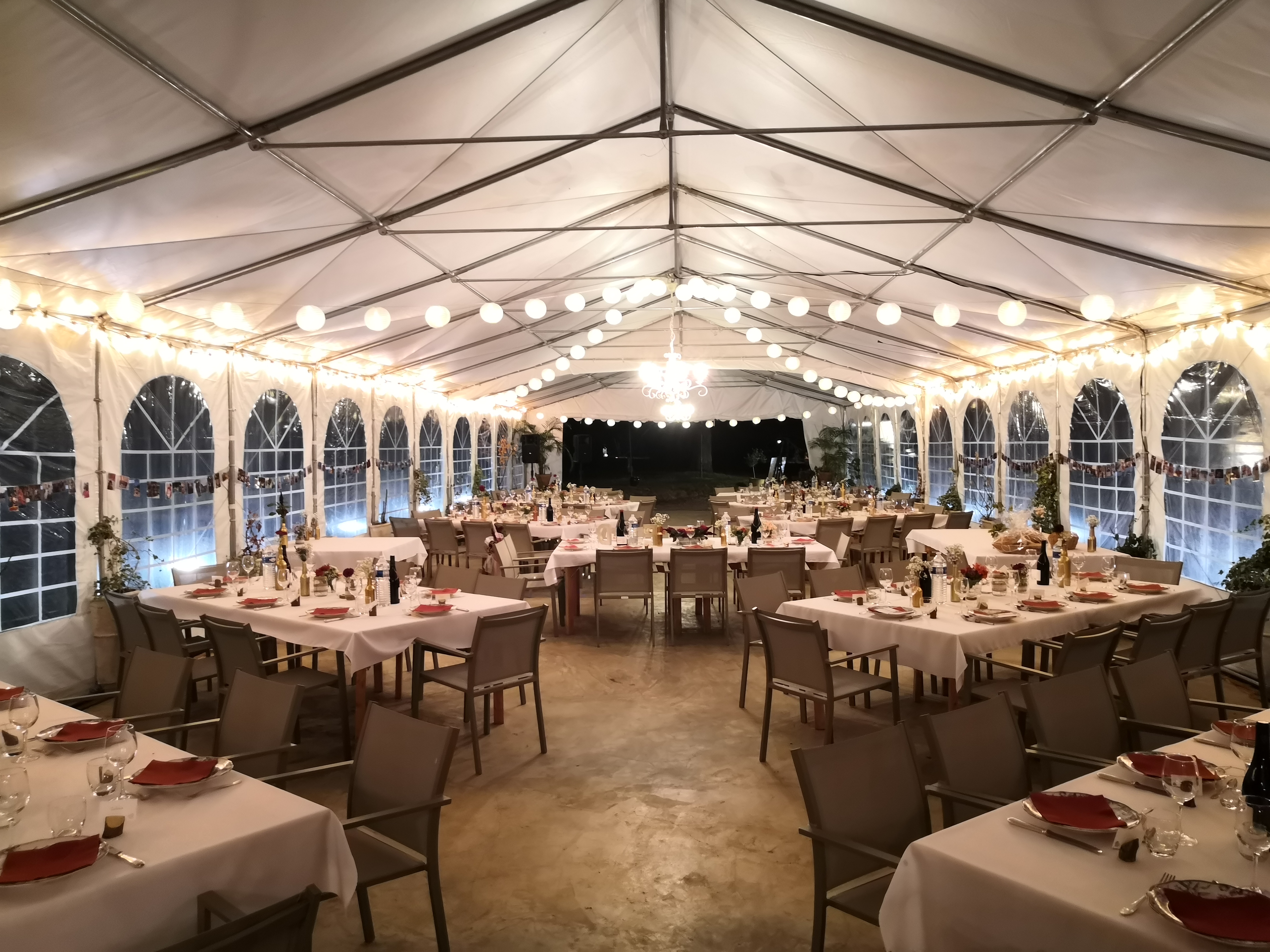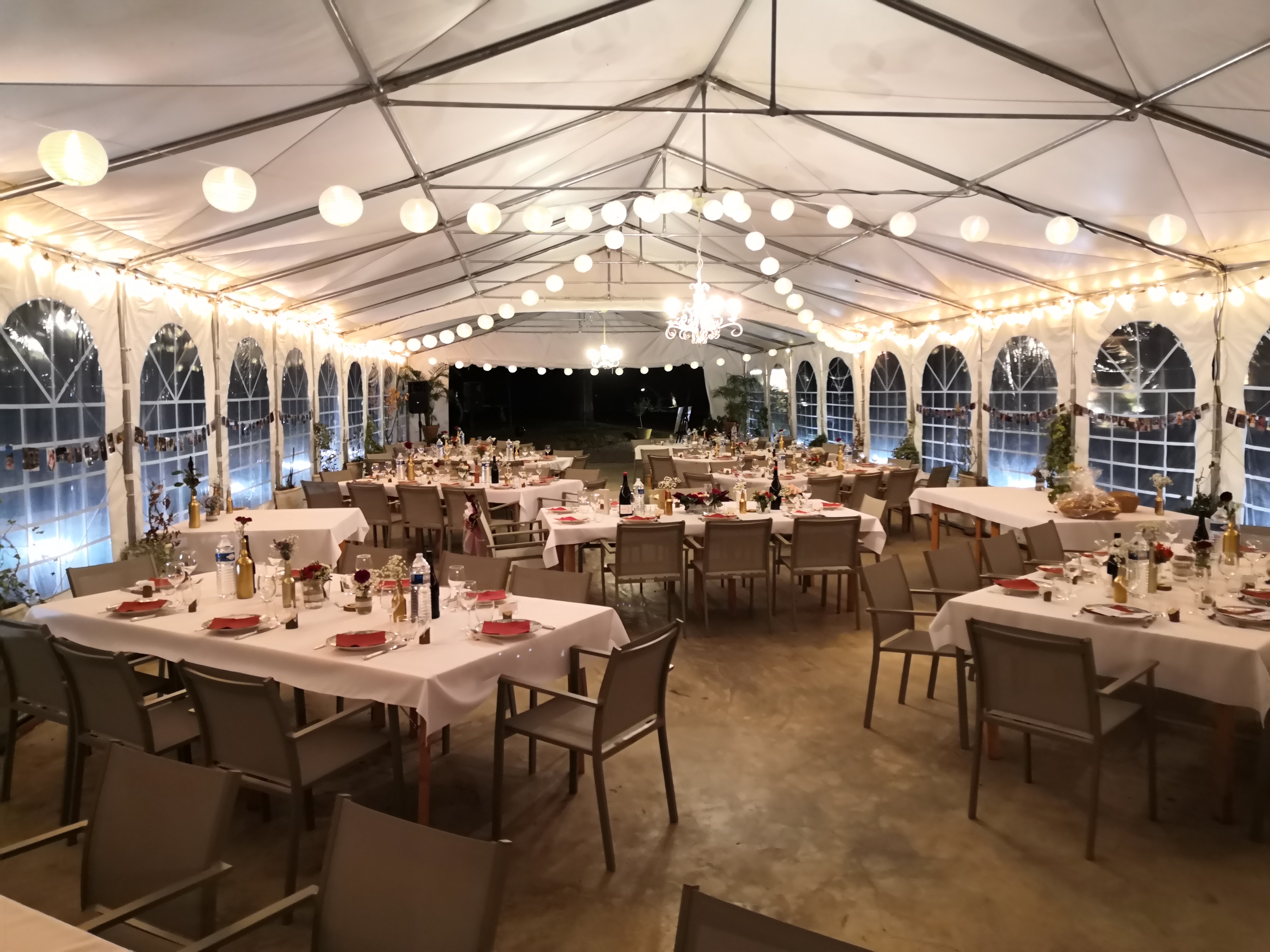 Le Domaine de Roucayrols vous offrira un décor verdoyant pour la réception du plus beau jour de votre vie. Dans le parc, un vin d’honneur peut être organisé autour de la roseraie. Votre repas sera installé sous un chapiteau sur une dalle de 300 m² qui vous permettra de recevoir jusqu’à 200 convives. Attenante, une salle de réception de 100 m² abrite la piste de danse pour votre soirée festive. Un local pour le traiteur est disponible à proximité, ainsi que les installations nécessaires pour se rafraîchir. Le Parking du Domaine peut recevoir environ 70 voitures.